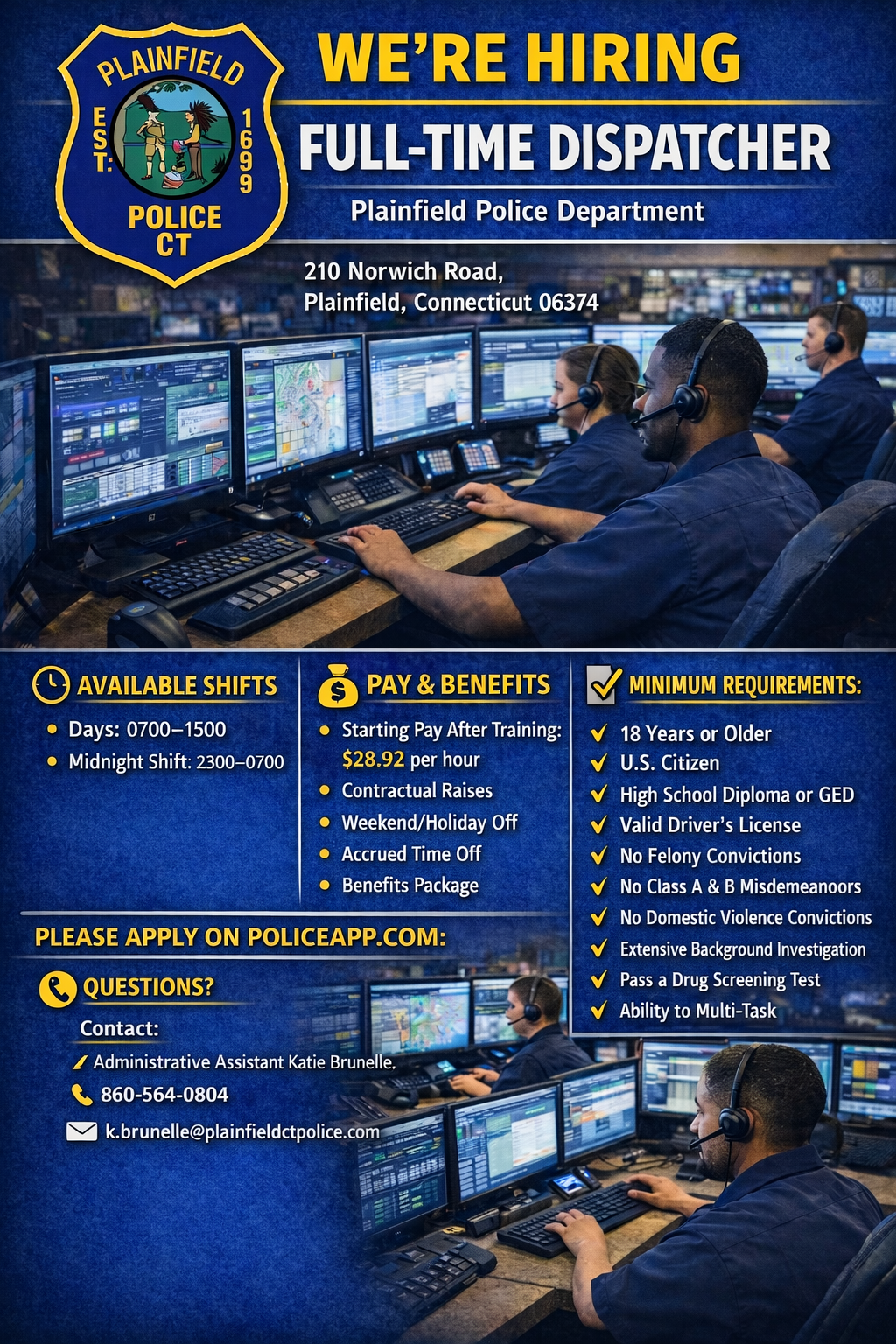 Please direct questions regarding this position to k.brunelle@plainfieldctpolice.com