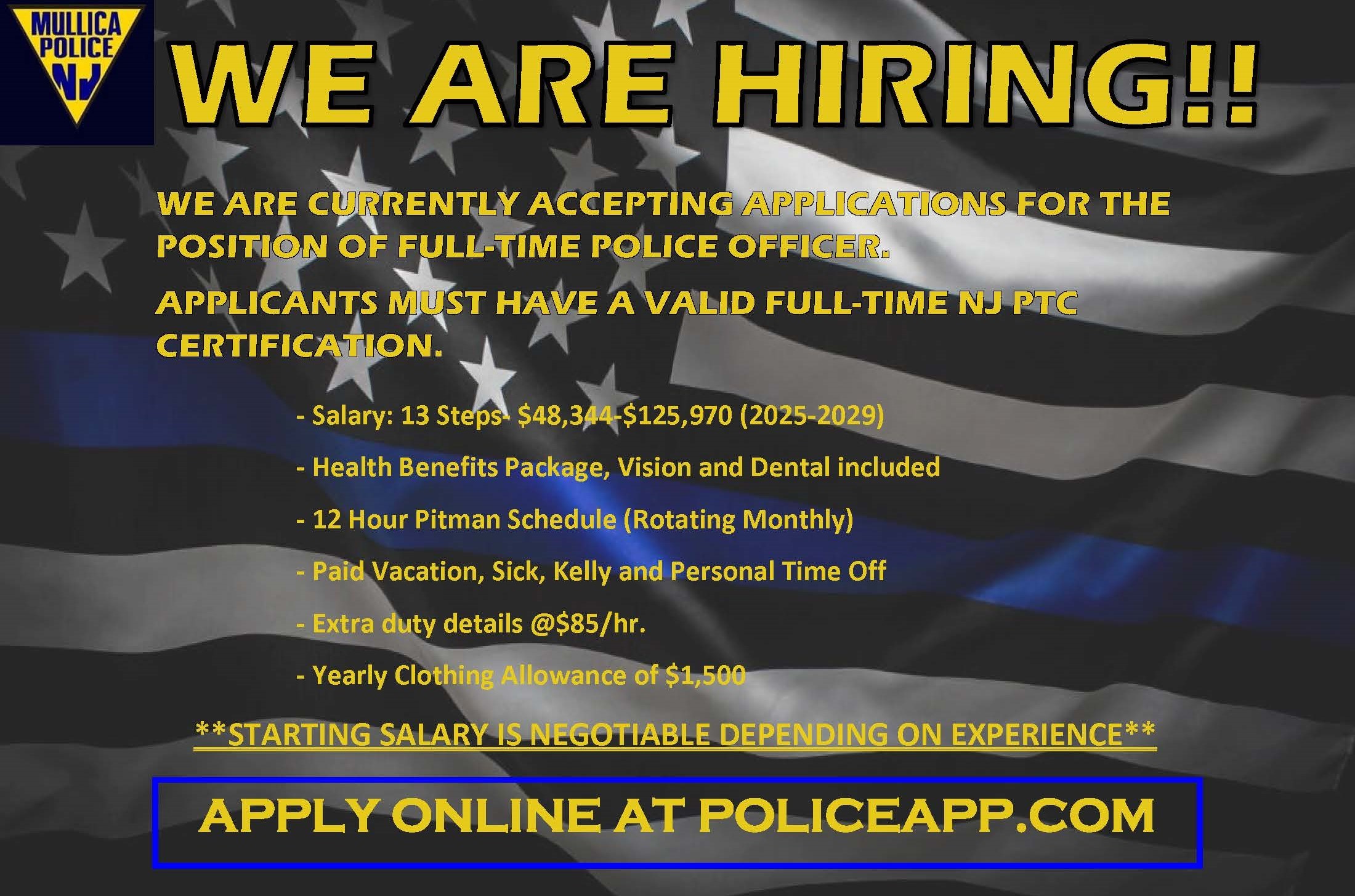 The Mullica Township Police Department is currently accepting applications for the position of Police Officer. The Mullica Township Police Department is located in Atlantic County. Applicants should be energetic, willing to learn, and take great pride in the community they serve. Applicants must minimally possess the following qualifications.